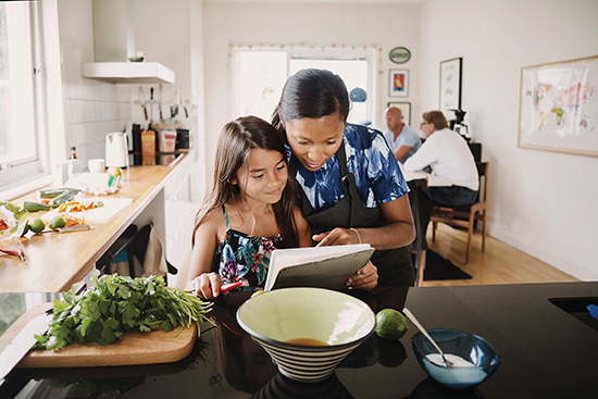 • Spend some time cooking or baking together. Use these experiences as opportunities to practice reading recipes or practice math by measuring and adding ingredients.