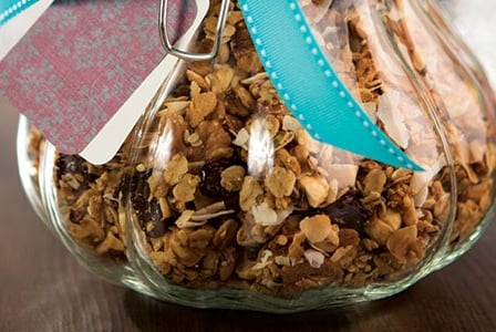 Holiday parties and indulgences can equal poor food choices, with the average adult gaining 1 lb (0.5 kg) between Thanksgiving and New Year’s. We might be tempted to “conserve” calories on the morning of a party, but this can lead to overeating later on. Instead, eat a fibre- and protein-rich breakfast that includes complex carbs such as oats. This Maple Hazelnut Granola is healthy and filling, especially when dressed up with fresh fruit and plain Greek yogurt.