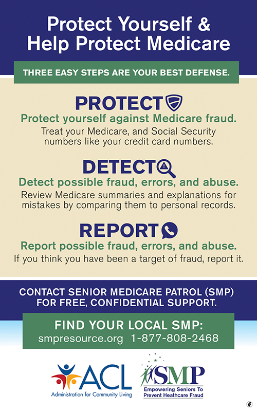 Scammers know the ins and outs of the Medicare system and their attempts can be well thought-out enough that it’s not always easy to know when and where fraud is occurring. By remembering some simple but effective tips, you can protect yourself against scams, including identity theft and prescription drug fraud. Remembering to protect, detect and report fraud helps everyone, including you.