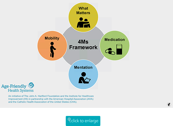 Just as the name implies, age-friendly care prioritizes what matters most to each individual older adult and helps meet goals such as daily walks around the neighborhood or cooking favorite meals. To get started, consider these four essential elements of age-friendly care from The John A. Hartford Foundation to discuss with your doctor:
