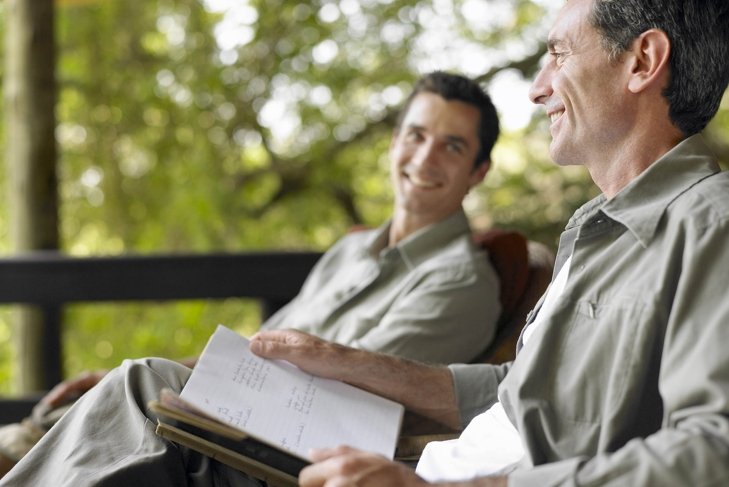 Side view of a happy man with book sitting on terrace with blurred male friend in background