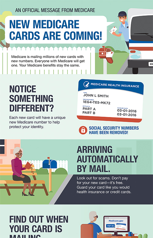 Millions of people with Medicare will receive new, more secure Medicare cards in the mail in 2018. The new cards replace Social Security Number-based Medicare numbers with a new, unique, personalized Medicare Number, known as the Medicare Beneficiary Identifier. Each person with Medicare will have his or her own number. The cards will be mailed automatically, free of charge, and there will be no changes to Medicare users’ current benefits.