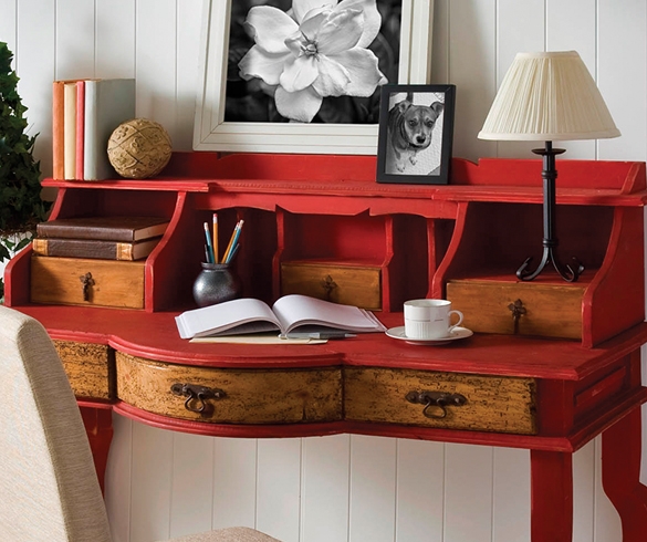 Using painter\’s tape, tape off areas not to be painted. Paint desk. Allow to dry and recoat as needed.