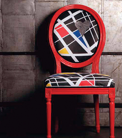 Cut out heart shape from scrap of painted canvas. Cover heart with clear crystals and use heat-setting tool to set crystals in place, following instructions on packaging. Use tacky glue to secure crystal heart to chair back. Allow to dry.
