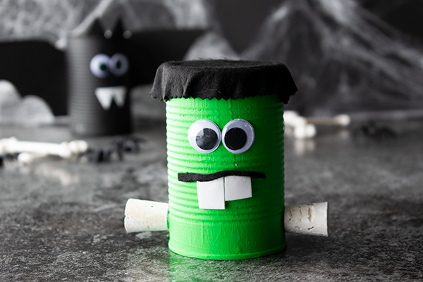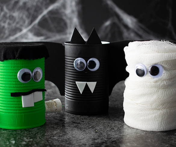 Get the kids involved with Halloween decorations this year with these easy-to-make “spooky cans” resembling a bat, Frankenstein and a mummy.
