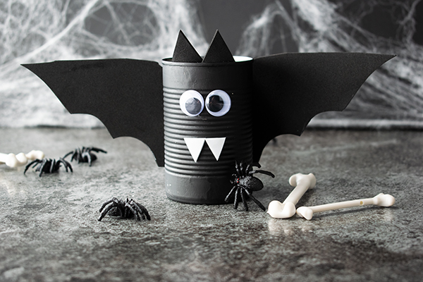 - Load hot glue stick into gun and allow to heat up. Apply glue on large edge of bat wing and press onto soup can. Repeat with second wing. Apply hot glue to bottoms of bat ears and apply to front inside of soup can. Apply hot glue to bottoms of bat fangs, turn upside down with points toward bottom and press onto soup can. Apply hot glue to backs of googly eyes and press onto soup can.