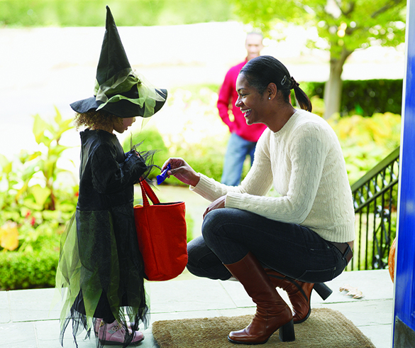 To ensure you’re ready for trick-or-treaters, remove tripping hazards from your yard and porch, including hoses, bikes and other toys, and clear wet leaves, snow or other debris from the sidewalk. Make it known you’re home by turning on your porch light; test it early and replace burnt out bulbs, if necessary, to ensure visibility. Also consider substitutes for sweets, which may contain ingredients some trick-or-treaters are allergic to, opting instead for more inclusive options such as stickers, coloring books, pencils, rubber insects or colored chalk.