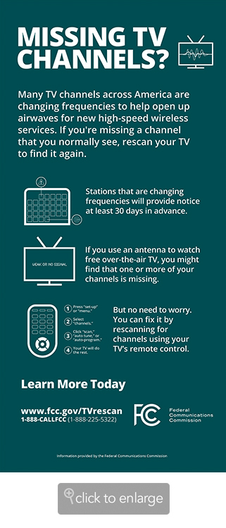For more information and tips on how to rescan, visit fcc.gov/TVrescan or call 1-888-CALLFCC (1-888-225-5322).