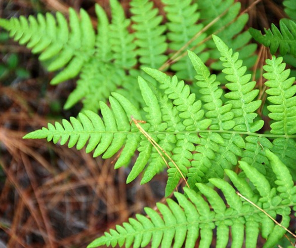 Next, we have an example of a Staghorn Fern. It does extremely well indoors. It’s an ideal plant, and it’s exotic looking. So it appeals to certain decors and certain tastes rather than the general population. It grows naturally attached to limbs up in the forest canopy in a tree. Because it’s covered in dense shade, it does very well indoors in low light. You might notice we have it growing in a wire basket covered with moss. We don’t want it in a pot because it’s an aerophyte. It’s used to being out here in the air. It doesn’t take much water so it’s an excellent indoor houseplant. It’s a little more open or airy. But if you want an exotic flair, it’s certainly a good one to consider.